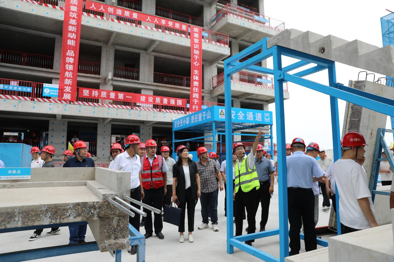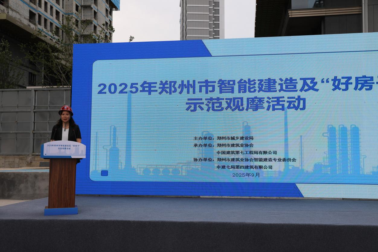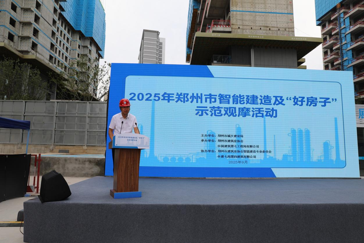 9月2日,由郑州市城乡建设局主办,郑州市建筑业协会、中建七局联合承办的“2025年郑州市智能建造及‘好房子’示范观摩活动”在中建七局郑州润璟园项目盛大举行。郑州市城乡建设局总经济师容美玲,郑州市建筑业协会会长高必成,市城建局建筑市场监管处处长岳全龙、节能装配发展中心主任刘杨、建筑市场监管处副处长张威,市建筑业协会秘书长王振,中建七局副总工程师、科技与设计管理部总经理黄延铮出席活动。各区县(市)建设主管部门负责人、骨干施工企业代表等300余人齐聚现场,共探智能建造创新路径,共话“好房子”建设实践。